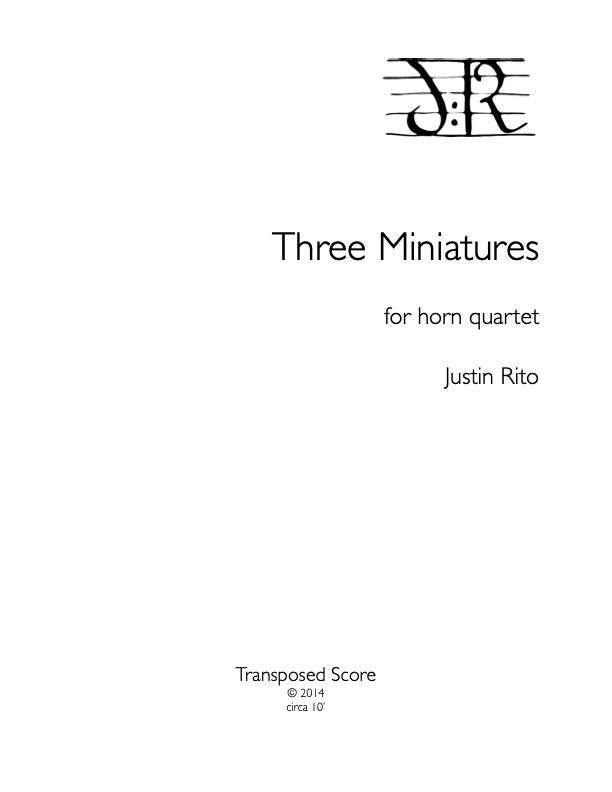 Three brief movements written for horn quartet. I wrote Three Miniatures as a DMA student, and it helped me to realize how interested I am in eclectic mixtures in style and aesthetic. The three are linked by a single motive, heard in Horn 1 at the beginning of Movement 2. The first movement is an exploration of different bell tone timbres within the quartet, the second is an off-kilter dance, and the third is a romantic finale.